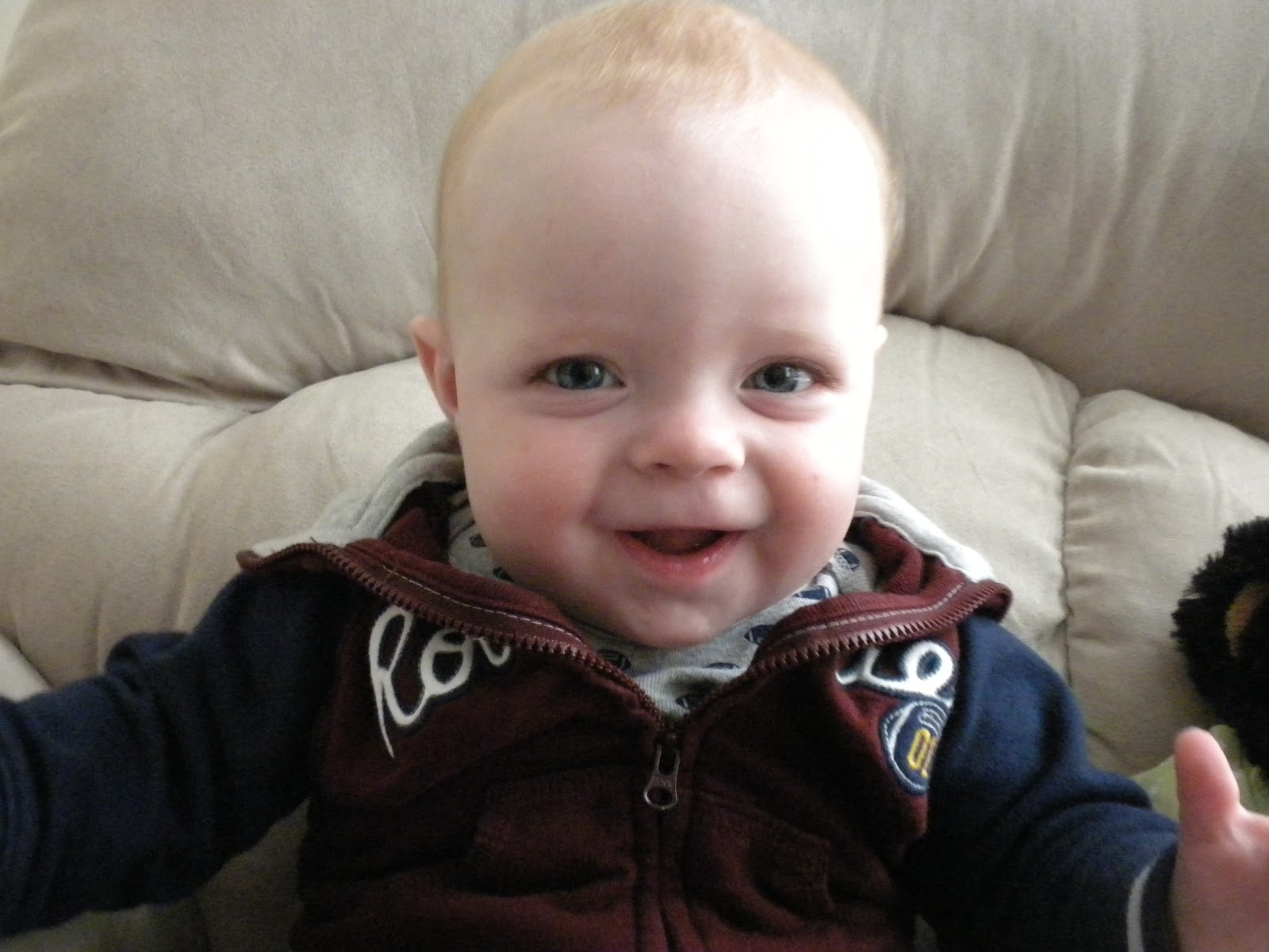 It turns out Isaac is not so big after all. We took him to his nine month appointment a few weeks ago and he had dropped a bit in all percentiles. He is now in the 20th percentile for height, 25th for weight (18 lbs 11 ounces) and 5th for head circumference. The doctor was not concerned but I was a little surprised that he is only in the 25th percentile for weight. He sure seems heavy. The pediatrician said he seems to be right on track for nine months!!!